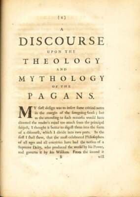Full leather boards with raised banded spine. Fair, boards detached, scattered foxing, signatures starting to separate. Title page loose but present, includes a list of subscribers, fourth edition. Includes the eight books, plus A Discourse Upon the Theology and Mythology of the Pagans, and A Letter From M. Freret ( Member of the Academy of Inscriptions at Paris) to the Author, Concerning the Chronology of His Work.