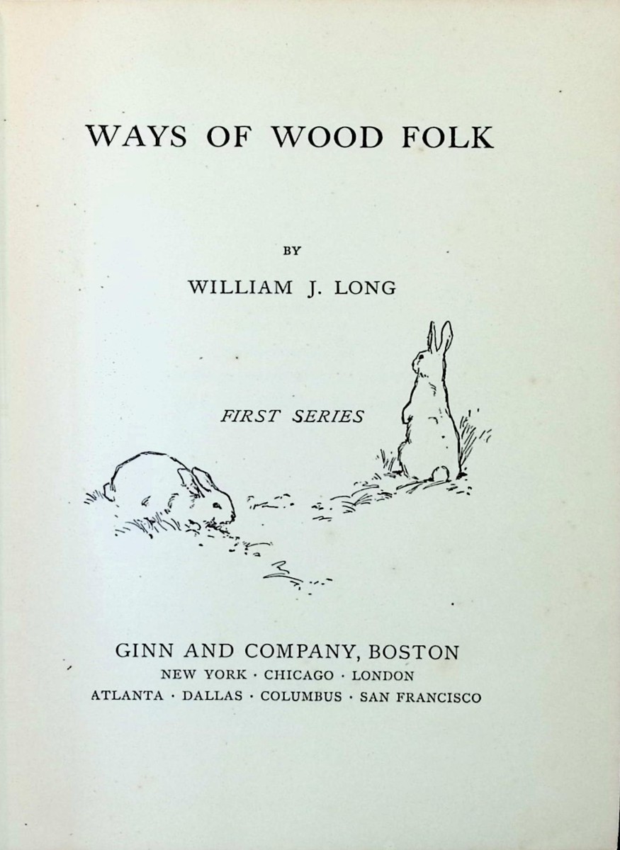 Long, William J. Ways of Wood Folk. Boston: Ginn and Company, 1899, First edition, X, 205 pp. Light green pictorial boards with darker green titles to the spine and front board. Moderate wear to edges and spine, two small spots on rear board. Age toning and light foxing to endpapers, previous owner's name. Frontispiece, half-tone illustrations, illustrated title page, seven engraved half-tone plates, with numerous engraved in-text illustrations. The store invites readers, young and old, to sharpen one's perception of the woodland animals beyond their typical behaviors, with the reward being the discovery of a multitude of personalities within any given species.